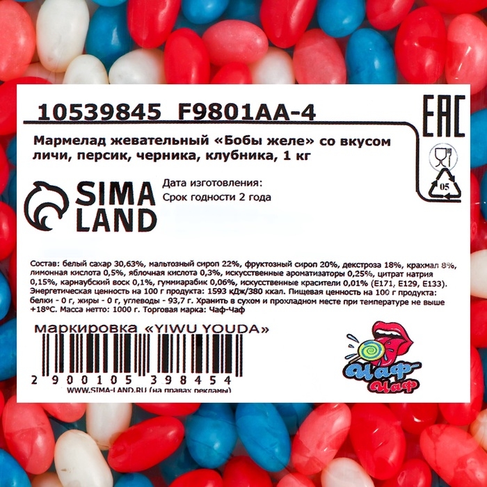 Мармелад жевательный "Бобы желе" со вкусом личи, персик, черника, клубника, 1 кг
