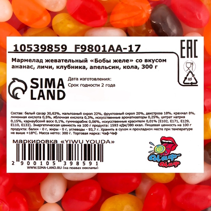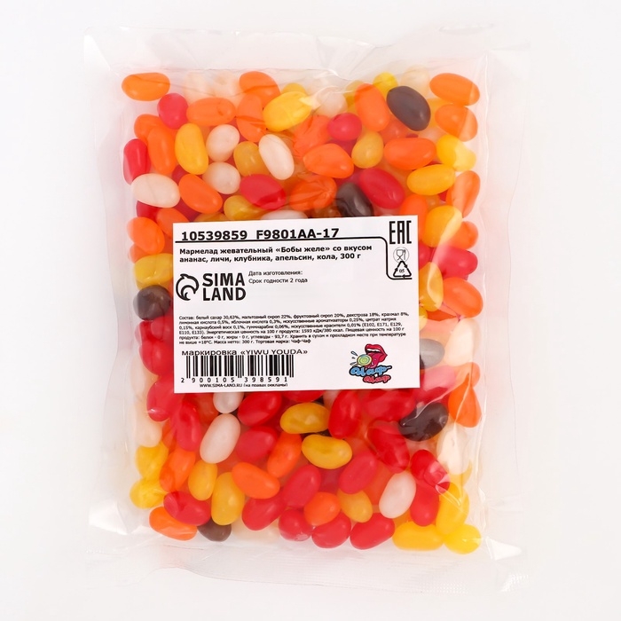 Жевательный мармелад "Бобы желе" — это не только сладость, но и настоящее удовольствие для ваших вкусовых рецепторов. Удобная упаковка делает его идеальным для перекусов в пути, на работе или в компании друзей. Испробуйте каждый вкус и откройте для себя незабываемые сочетания в мире жевательных бобов!