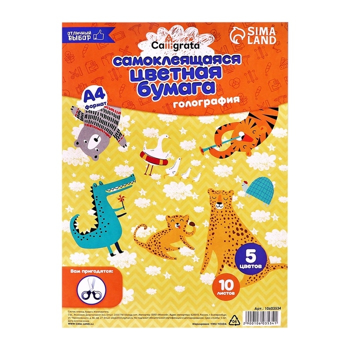 Бумага цветная формат А4 10 листов 5 цветов самоклеящаяся голография
