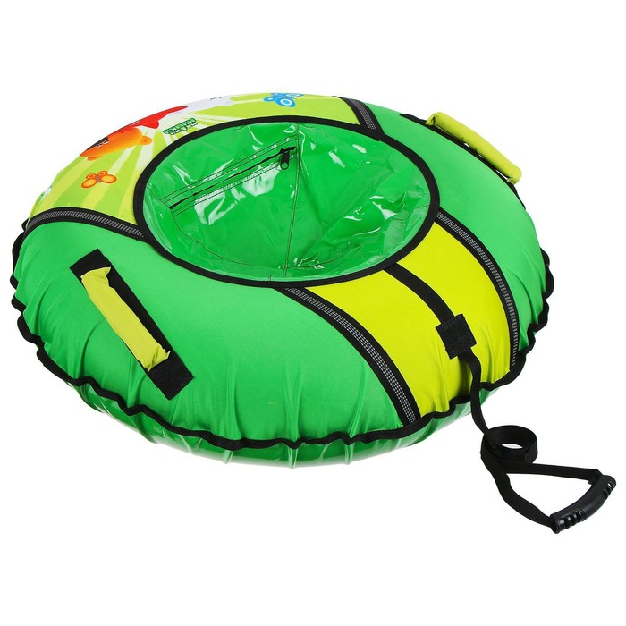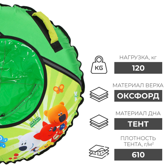 Дно тюбинга изготовлено из автотента ПВХ 610, что гарантирует долгий срок службы и обеспечивает отличное скольжение. Тюбинг оснащён безопасными эргономичными ручками и молнией для быстрого доступа к камере. Он имеет закрытую сердцевину, что исключает попадание снега внутрь. Фактический размер накачанного тюбинга зависит от температуры внешней среды и давления в камере. Для тюбинга подойдёт камера 14 дюймов. Предназначен для детей от 3 лет.