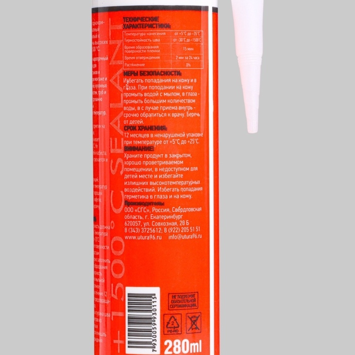 UTURA однокомпонентный силикатный герметик, устойчивый к воздействию очень высоких температур до +1500 °C. Высококачественный жаропрочный герметик применяется для герметизации швов, стыков и заполнения трещин при монтаже и ремонте каминов, печей, кухонных плит, отопительных систем, труб и дымоходов в местах, где важно обеспечить стойкость к воздействию высоких температур. Технические данные Основа: Однокомпонентный силикатный герметик. Цвет: черный Плотность: 1.8 ± 0,01 Температура нанесения: +5 °C до +35 °C Температура эксплуатации: –30°С до +1500°С Время высыхания поверхности: 15 минут. Время отверждения 2 мм за 24 часа. Коэффициент растяжения: 0% Состав Силикат натрия, каолин, диоксид кремния Упаковка 280мл картридж Хранение и срок годности При хранении в оригинальной упаковке в сухом и прохладном месте при температуре +5 °C до +25 °C срок годности продукта составляет 12 месяцев с даты изготовления. В странах с высокой температурой и влажностью специальные условия хранения должны быть созданы. Храните продукт в закрытом, хорошо проветриваемом помещении и избегайте излишних высокотемпературных воздействий.