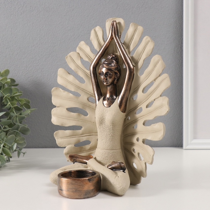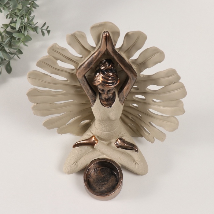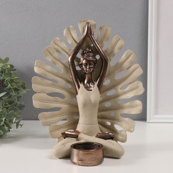 Сувенир полистоун подсвечник "Девушка в позе лотоса у монстеры" под бронзу d=4,3 см 12,3х22х25 см