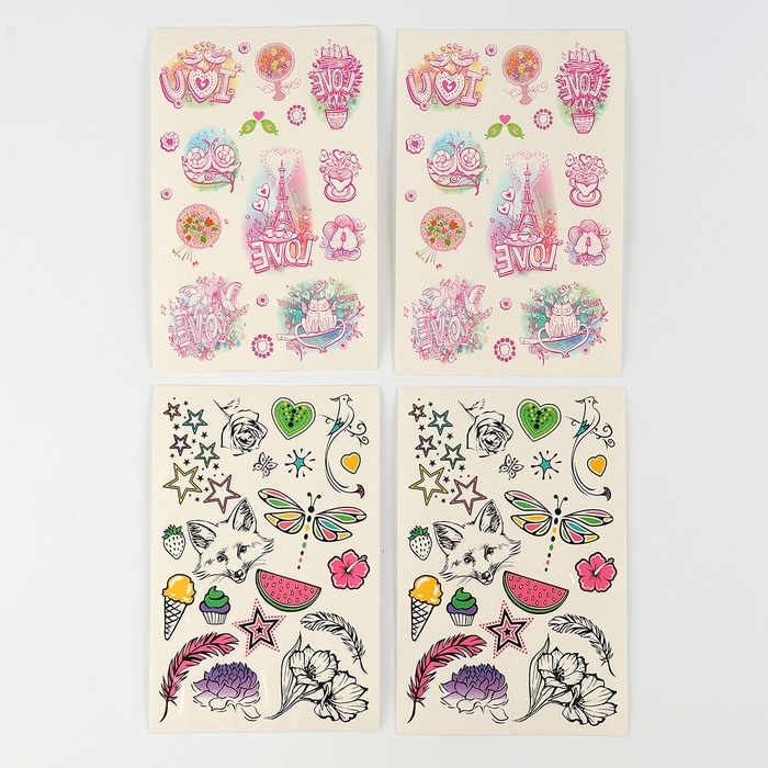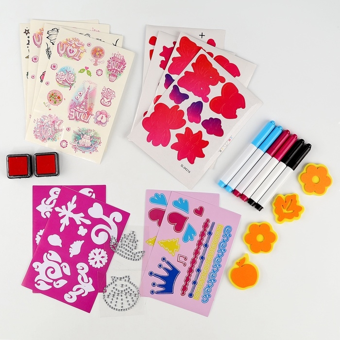 Тату студия понравится каждой девочке. Внутри малышка найдёт лист с тату-переводками, трафареты, штампики и фломастеры.