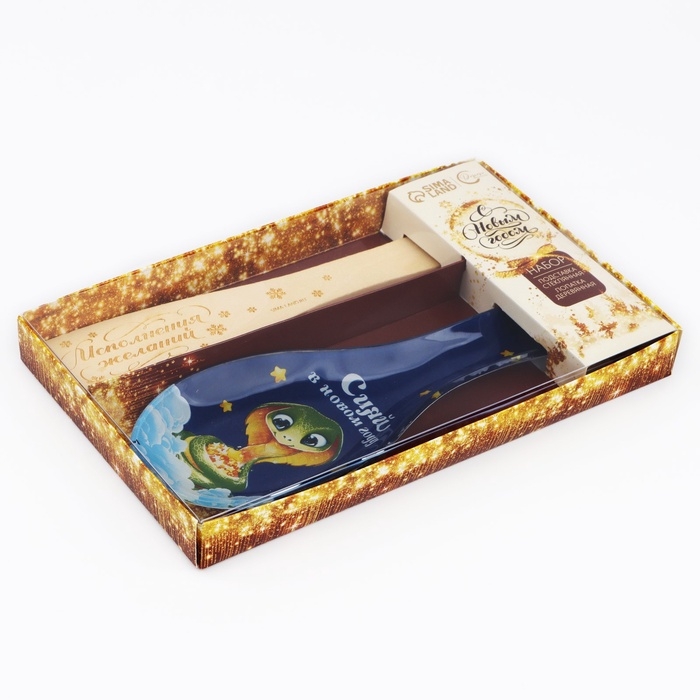 Подарочный набор состоит из стеклянной подставки под ложку размером 21,4 x 7,5 x 2 см и деревянной лопатки.