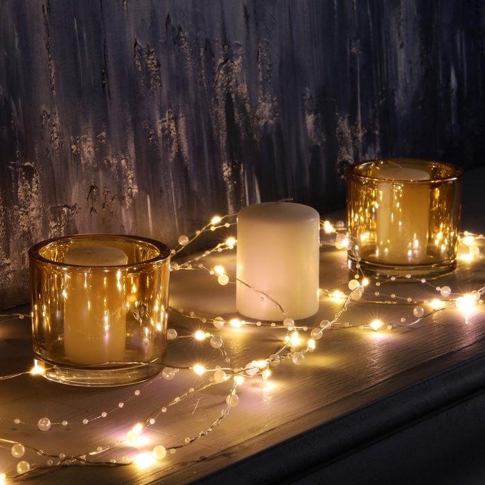 Гирлянда «Нить» 5 м роса с насадками «Перламутр», IP20, нить серебристая, 50 LED, батарейки AAx2 (не в комплекте), 2 режима, свечение тёплое белое