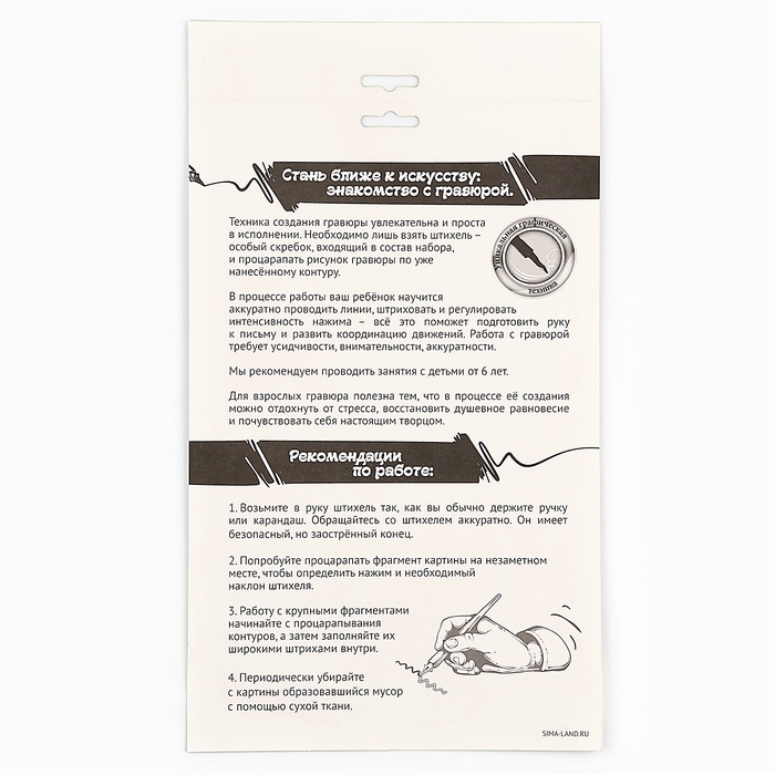 Гравюра представляет собой многослойное панно, покрытое чёрной краской, на которое нанесён контур рисунка. С помощью особого скребка (штихеля), который входит в набор, путём процарапывания и создается гравюра. Новая серия с уникальным дизайном порадует вас разнообразием рисунков.