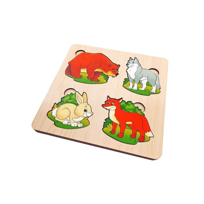 Попросите ребёнка перечислить животных, расположенных на доске. Как можно назвать их одним словом? Затем переверните доску, разложите вкладыши на столе и предложите малышу отложить отдельно медведей, зайцев, лис и волков.