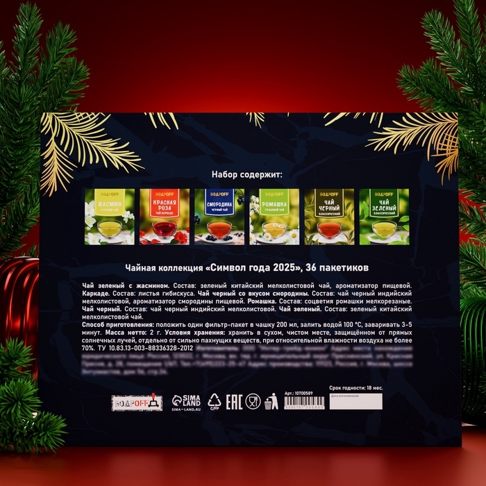Внутри красивой упаковки вы найдете чай, который обладает уникальным вкусом и ароматом, способным подарить вам мгновения радости и расслабления. Уникальный дизайн упаковки, где изображен символ змея, добавляет особую нотку волшебства. Эта символика наполняет набор не только эстетикой, но и глубоким смыслом и удачей на наступающий год, что делает его прекрасным подарком в новогодние праздники и на любой другой торжественный случай.