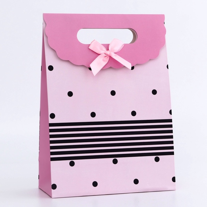 Подарочная коробка-пакет, упаковка с вырубной ручкой, "Розовый горох" , 19 х 9 х 27 см