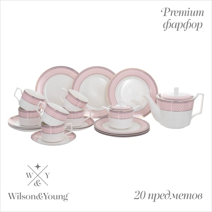 Чайный сервиз WY Paradaise, 20 предметов, чайник 1000 мл, 6 кружек 250 мл, 6 блюдец d=15,5 см, 6 тарелок пирожковых d=20,5 см, фарфор