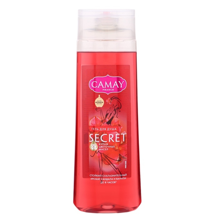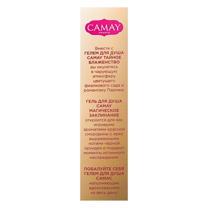 - Гель для душа Camay Тайное блаженство раскрывается соблазнительными нотками фиалок, которые переходят в аккорды ванили и сандала и создают чувственный притягательный аромат. Парфюмированный женский гель для душа Камей обогащен цветочными маслами лаванды, иланг-иланга, душицы, которые вместе с другими активными ингредиентами делают кожу гладкой и благоухающей.