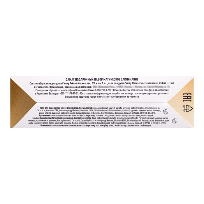 - Гель для душа Camay Тайное блаженство: Aqua,Sodium Laureth Sulfate, Glycerin, Sodium Chloride, Benzophenone-4, Citric Acid, Cocamide DEA, Cocamidopropyl Betaine, Disodium EDTA, Disodium Laureth Sulfosuccinate, Parfum (содержит эфирные масла лаванды, иланг-иланга, душицы), Sodium Benzoate, Benzyl Salicylate, Citronellol, Hexyl Cinnamal, Limonene, Linalool, CI 17200, CI 19140, CI 42090.