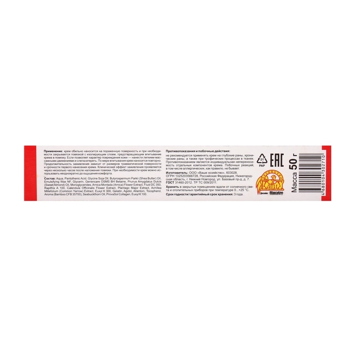 Мазь содержит природные высокоактивные эфирные масла (облепиховое, миндальное, соевое, масло ши), экстракты лекарственных растений (календула, подорожник, арника, тысячелистник) и витамин E. Аллантоин интенсивно смягчает и увлажняет кожу, успокаивает раздражённую кожу, а д-пантенол устраняет сухость кожи и мелкие повреждения.