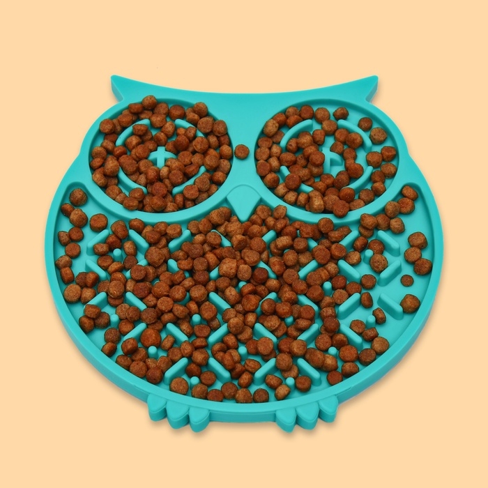 Яркий цвет и форма: Зеленый цвет и форма в виде совы делает коврик визуально привлекательным для домашних животных, что побуждает их к игре и исследованию.