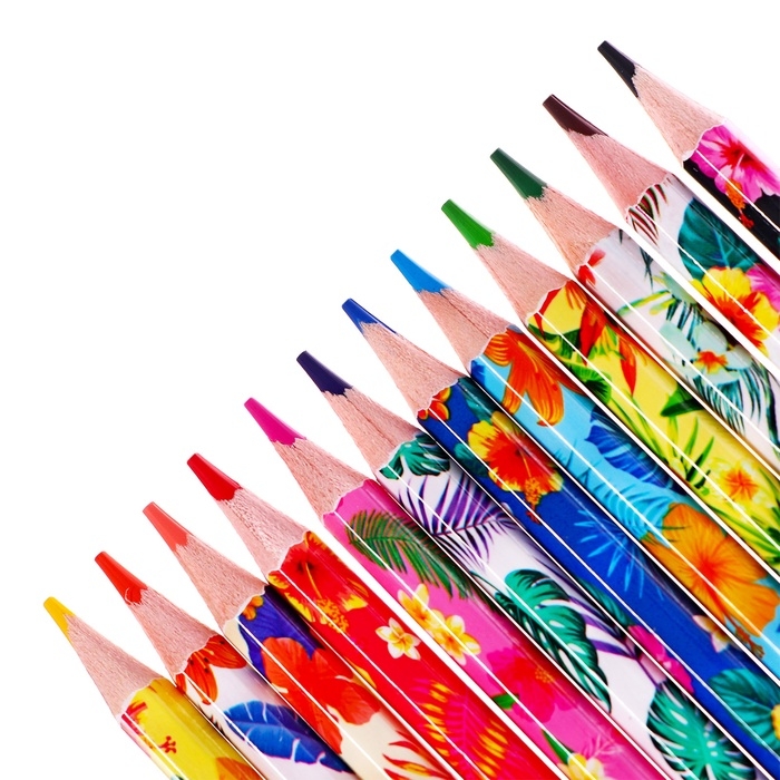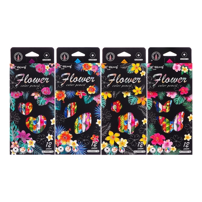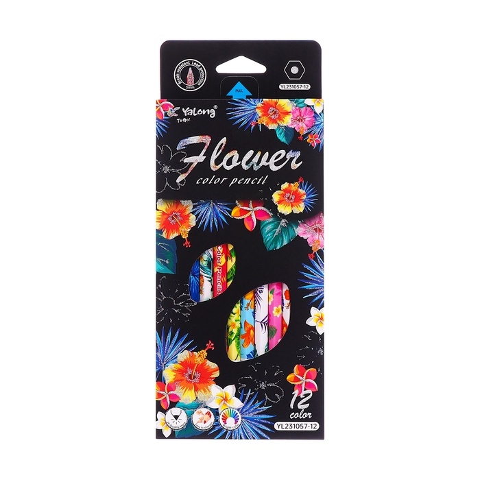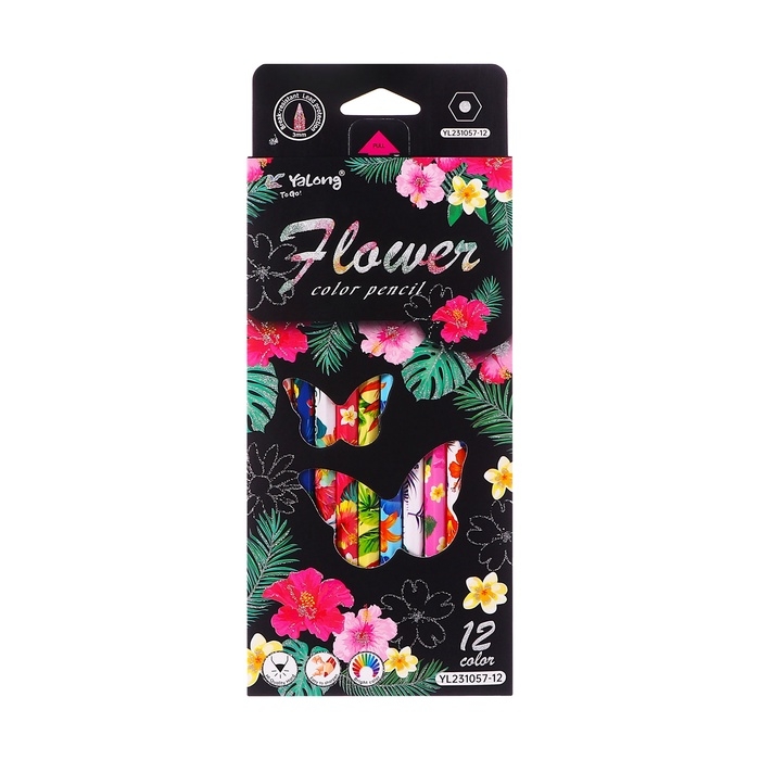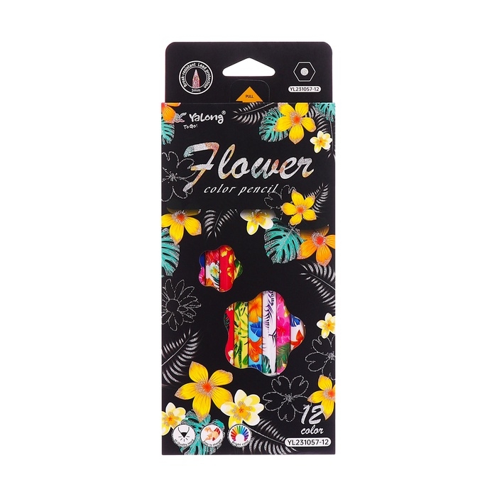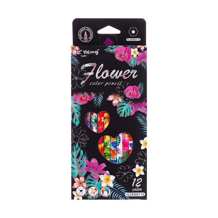 Карандаши 12 цветов в картонной коробке, шестигранные, деревянные,Цветы на чёрном МИКС