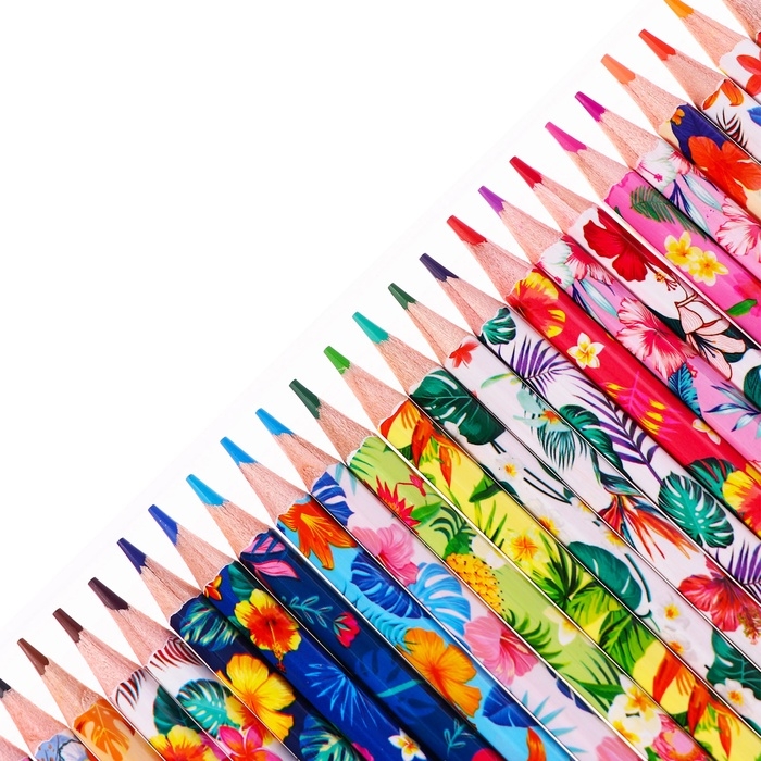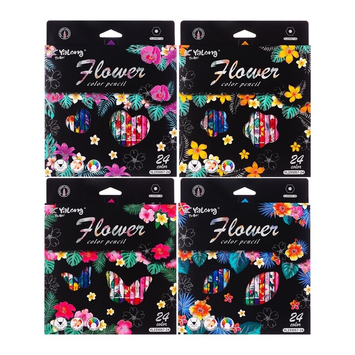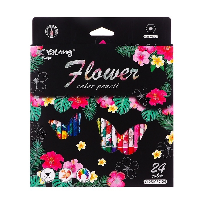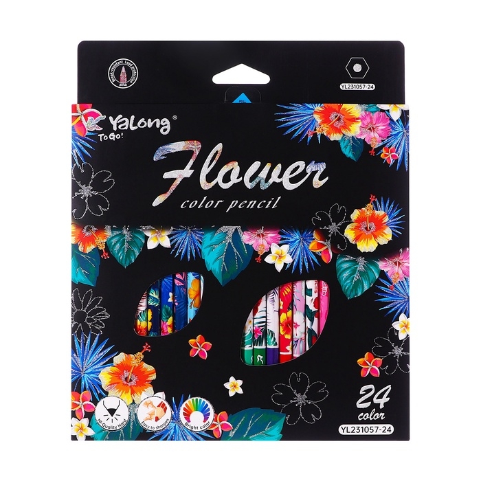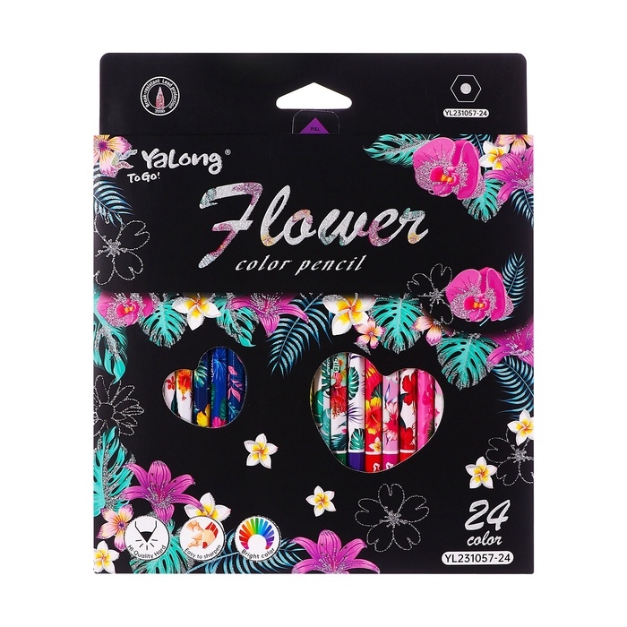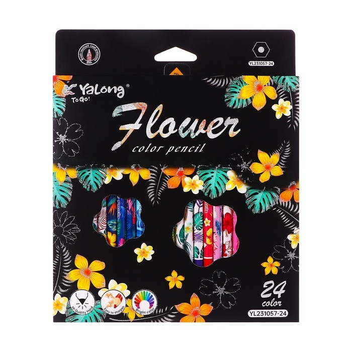Карандаши 24 цвета в картонной коробке, шестигранные, деревянные,Цветы на чёрном МИКС