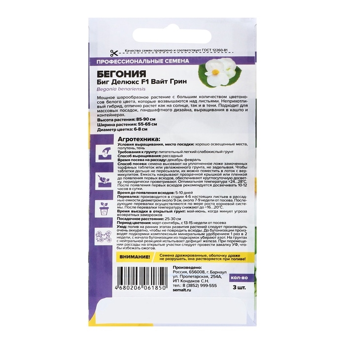 Семена цветов Бегония Биг Делюкс F1 Вайт грин, ц/п, 3 шт.