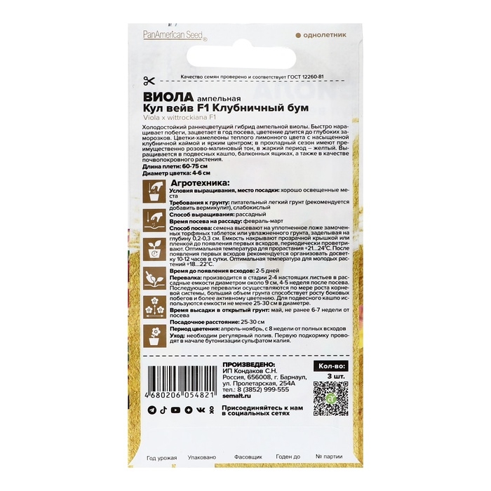 Семена цветов Виола Кул Вейв F1 Клубничный бум ампельная, ц/п, 3 шт.