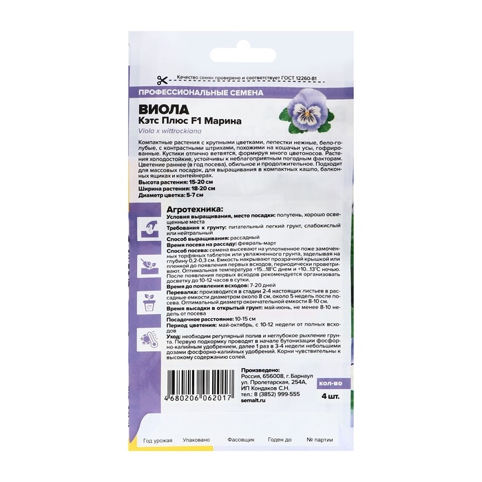 Семена цветов Виола Кэтс Плюс F1 Марина, ц/п, 4 шт.