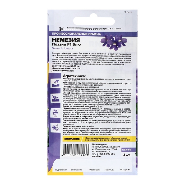 Семена цветов Немезия "Поэзия" F1 Блю, ц/п, 3 шт.