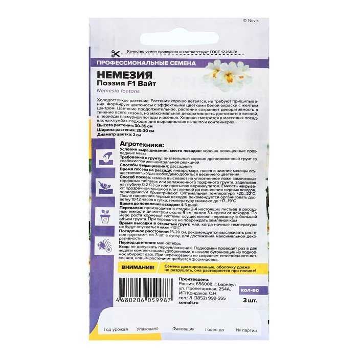 Семена цветов Немезия "Поэзия" F1 Вайт, ц/п, 3 шт.