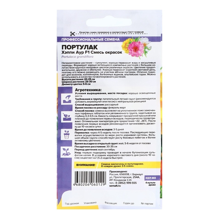 Семена цветов Портулак "Хэппи Аур" F1 Смесь окрасок, ц/п, 4 шт.