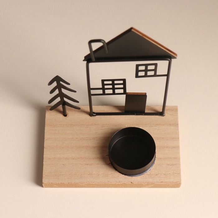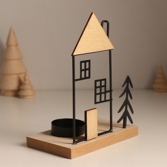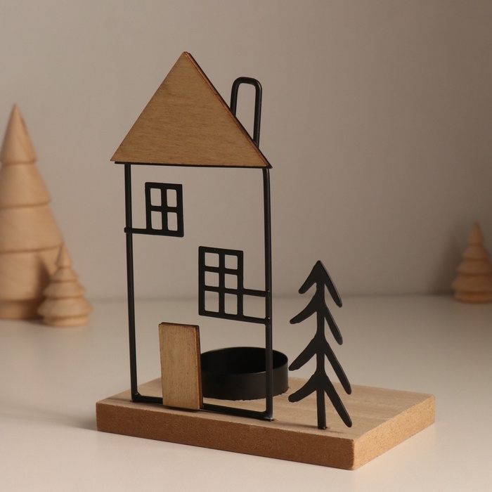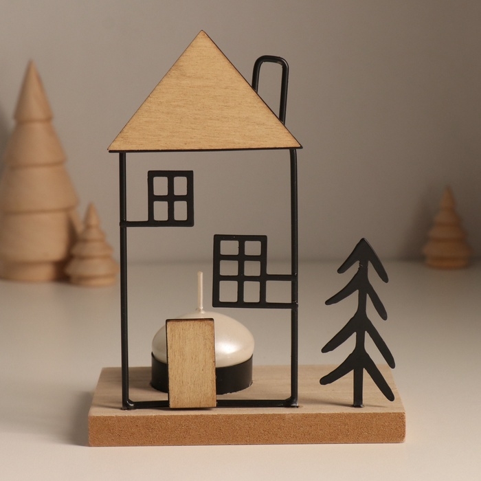 Подсвечник металл, дерево на 1 свечу "Ёлочка у домика с трубой" d=4 см 7,5х12х15,5 см