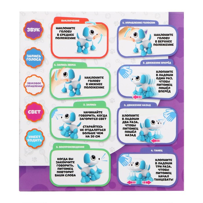 Игрушка оснащена звуковыми датчиками. Питомцем можно управлять с помощью звуков: