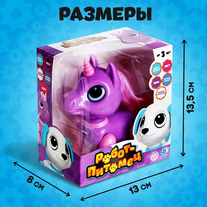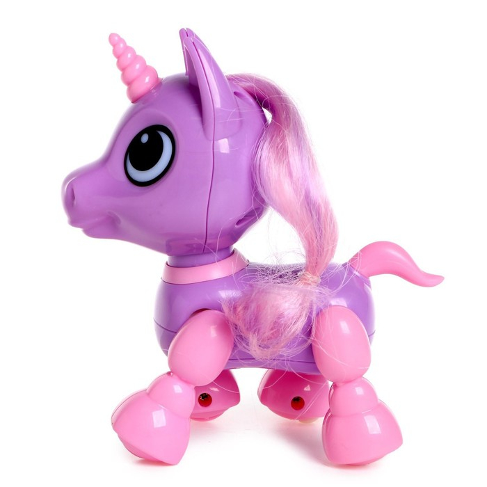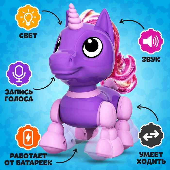 Робот единорог «Питомец» IQ BOT, интерактивный: с записью звуков, реагирует на хлопки, звук, свет, на батарейках, фиолетовый