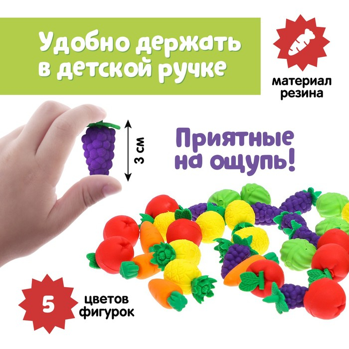 Обучающий набор «Яркий урожай» надолго увлечёт ребёнка, поможет в развитии моторики, внимания и в изучении цветов, счёта. Малыш запомнит названия фруктов и овощей.