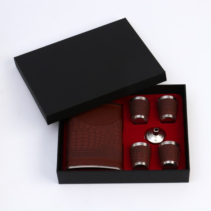 Подарочный набор 6 в 1: фляжка 270 мл, воронка, 4 рюмки, коричневый, 17 х 21 см