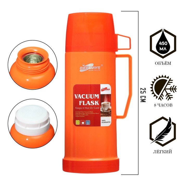 Термос 450 мл, со стеклянной колбой, с кружкой, 12 х 25 см, оранжевый
