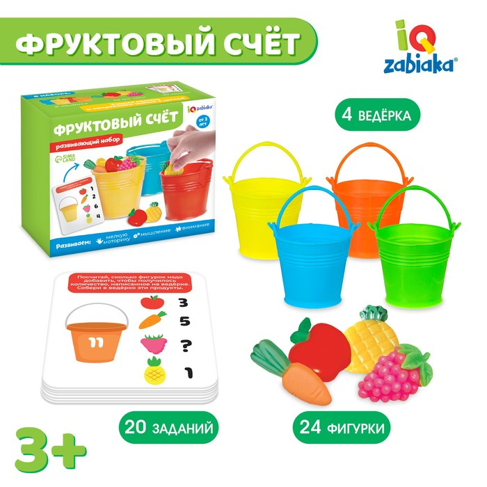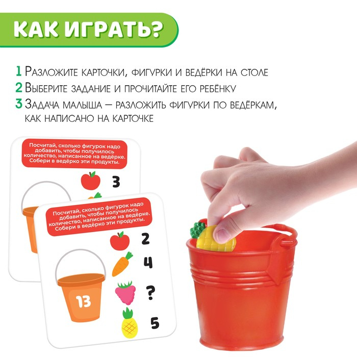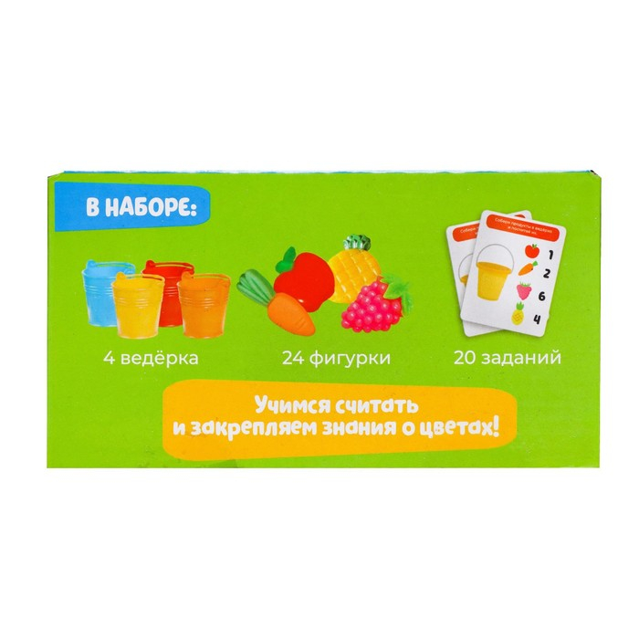 В комплект входит: 4 ведёрка, 24 пластиковые фишки и карточки с заданиями.
