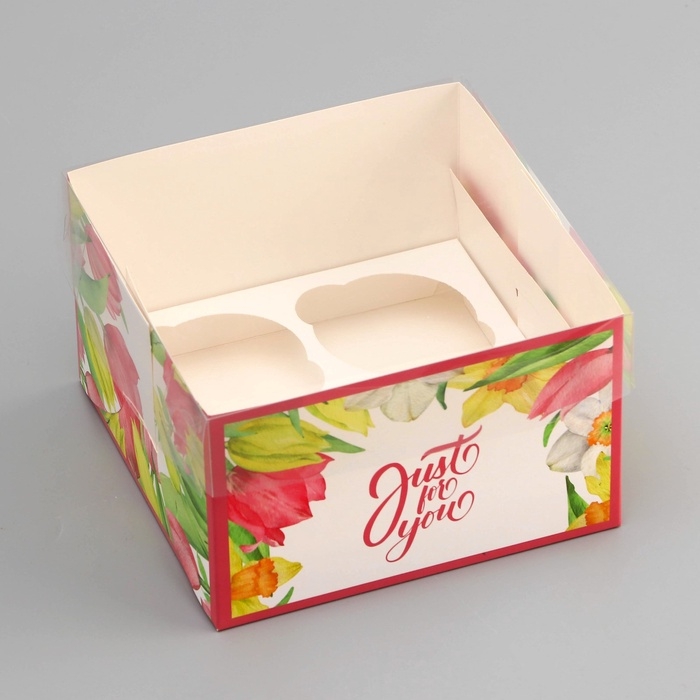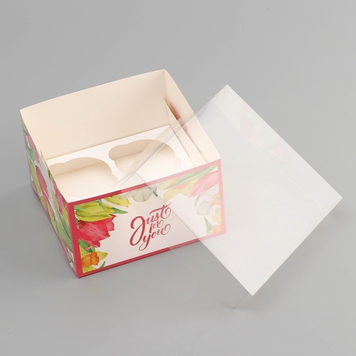 Коробка для 4 капкейка с прозрачной крышкой, "Тюльпаны", 16 × 16 × 10 см, кондитерская упаковка