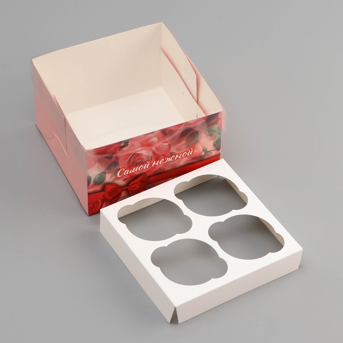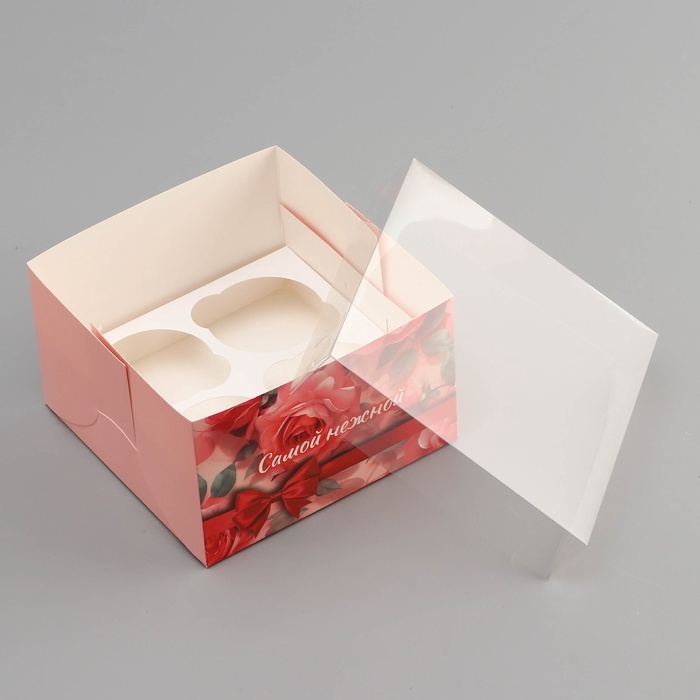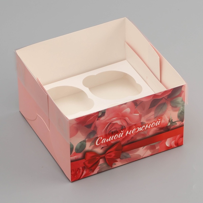 Коробка для 4 капкейка с прозрачной крышкой, "Самой нежной", 16 × 16 × 10 см, кондитерская упаковка
