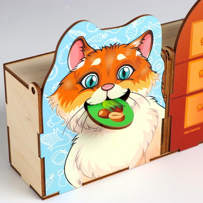 Кажется, котик проголодался. Скорее накорми его! Для этого сложи в ящик с котиком только те фишки, на которых нарисована еда.