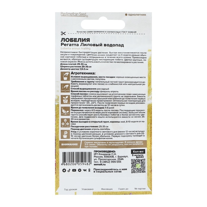 Семена цветов Лобелия Регатта "Лиловый Водопад" ампельная, ц/п, 5 шт