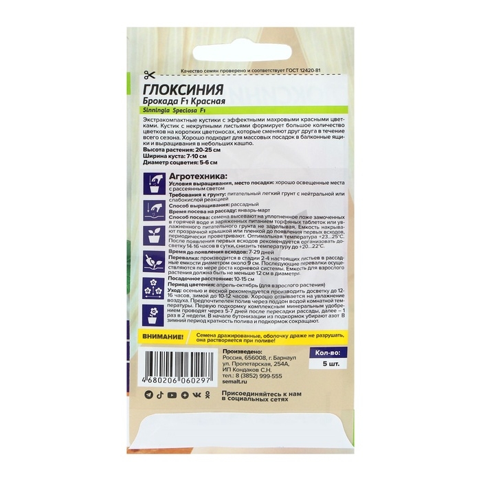 Семена комнатных цветов Глоксиния Брокада "Красная", F1, ц/п, 5 шт
