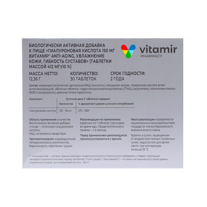 Гиалуроновая кислота «Витамир» Anti-Aging, увлажнение кожи, гибкость суставов, 30 таблеток