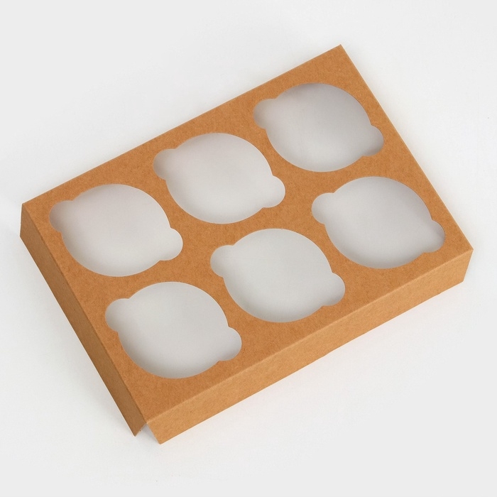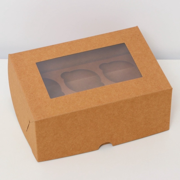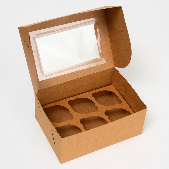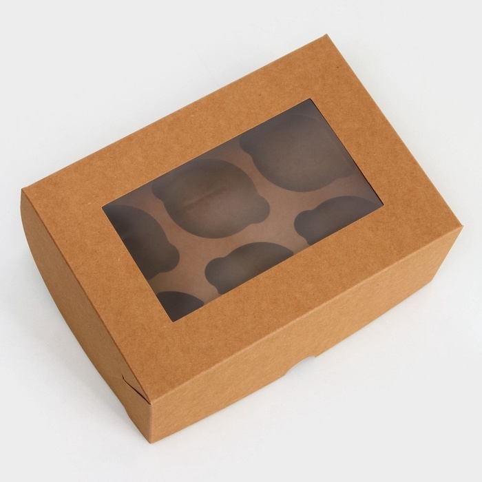 Коробка на 6 капкейков с окном, крафт, 25 х 17 х 10 см