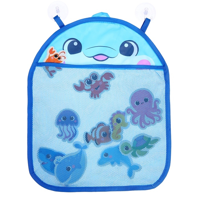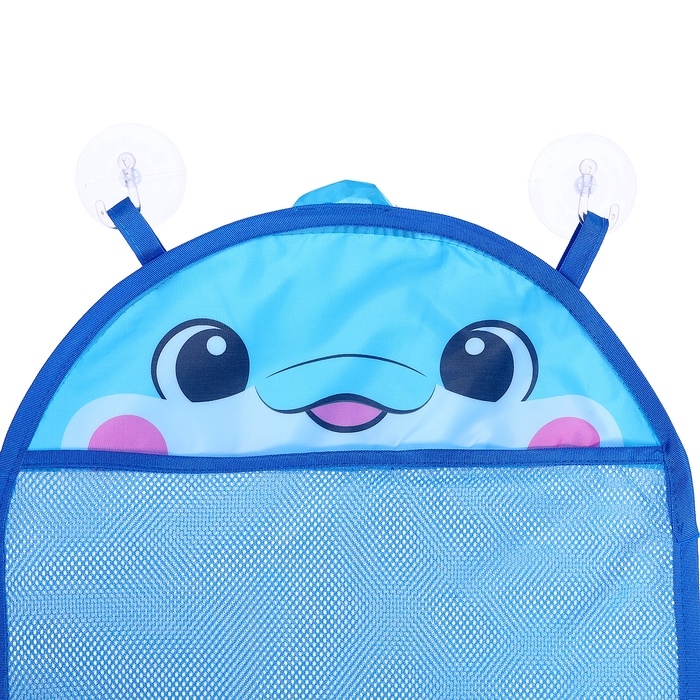 - Сетка с изображением дельфинчика крепится на надёжные присоски — для удобного размещения в ванной.