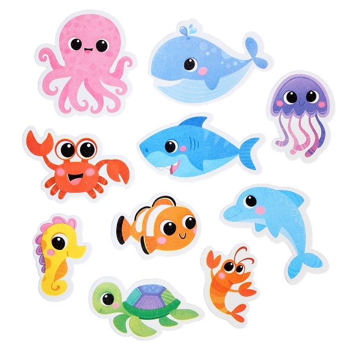 - 11 игрушек из мягкого материала EVA, изображающих морских обитателей.