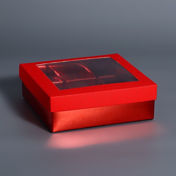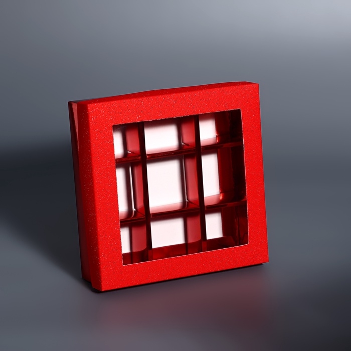 Коробка для 9 конфет красный глиттер, 12,5 х 12,5 х 4 см. Кондитерская упаковка