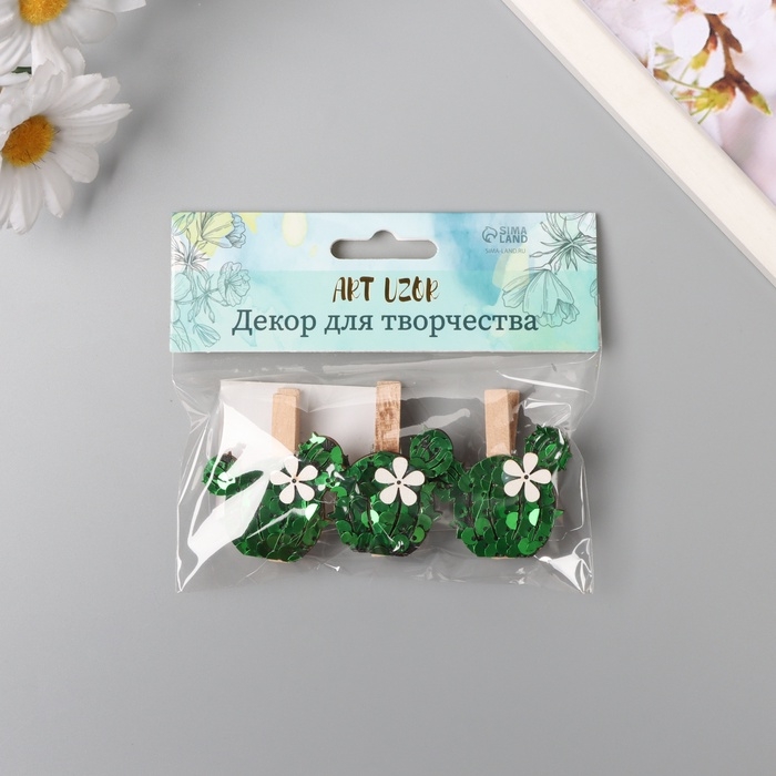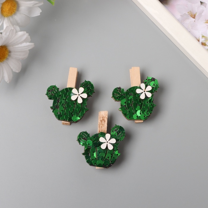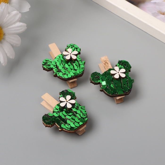 Декор для творчества дерево "Прищепка. Кактус с цветком" пайетки набор 3 шт 1,5х4х4,8 см