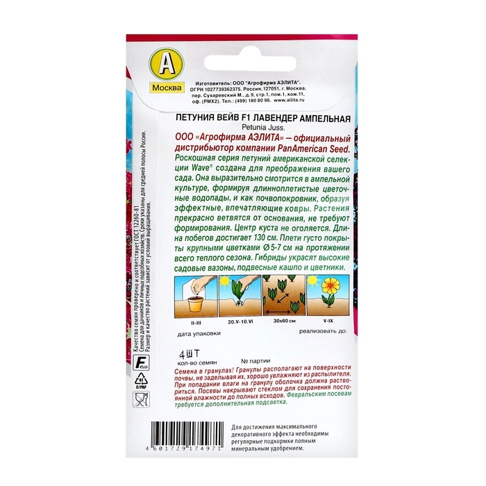 Семена цветов Петуния "Вейв" F1 лавендер ампельная, ц/п, 4 шт