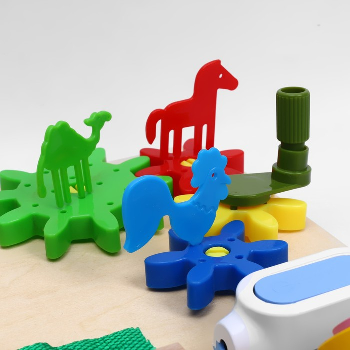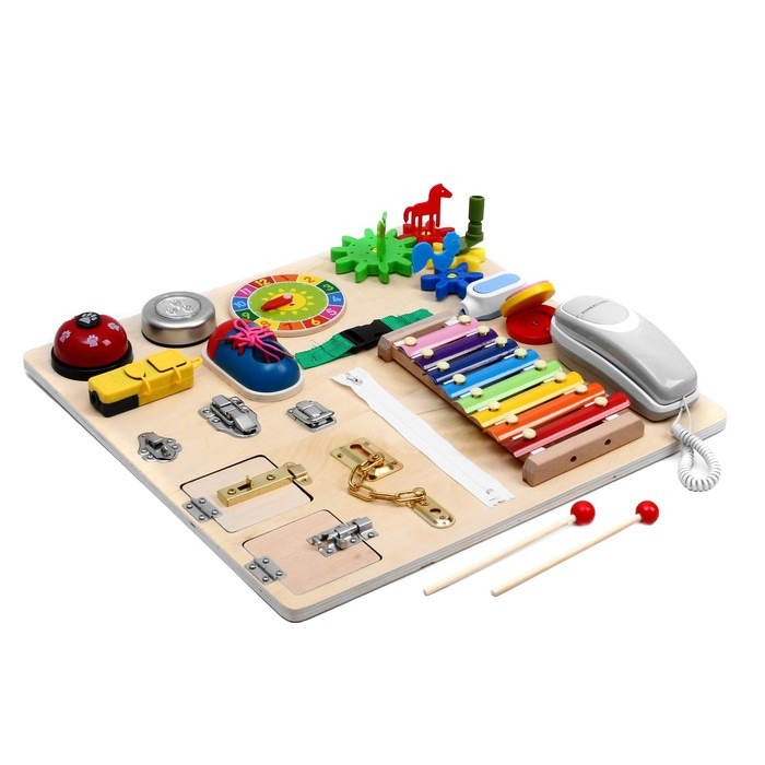 Бизиборд «Сказка» — это развивающая доска, к которой прикреплены замочки, шпингалеты, шестерёнки, розетка, шнуровка, металлофон, часики, молния, телефон.