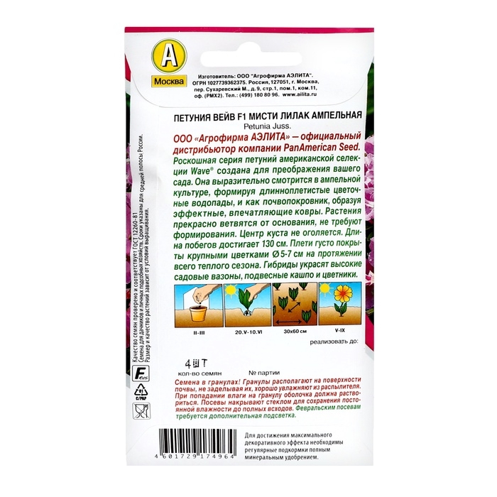 Семена цветов Петуния "Вейв" F1 мисти лилак ампельная, ц/п, 4 шт