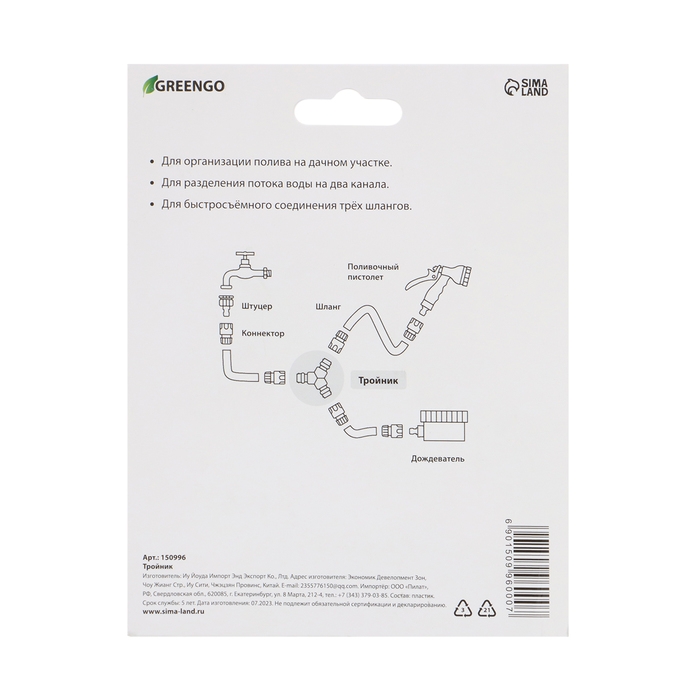 Тройник, быстросъёмное соединение, пластик, Greengo