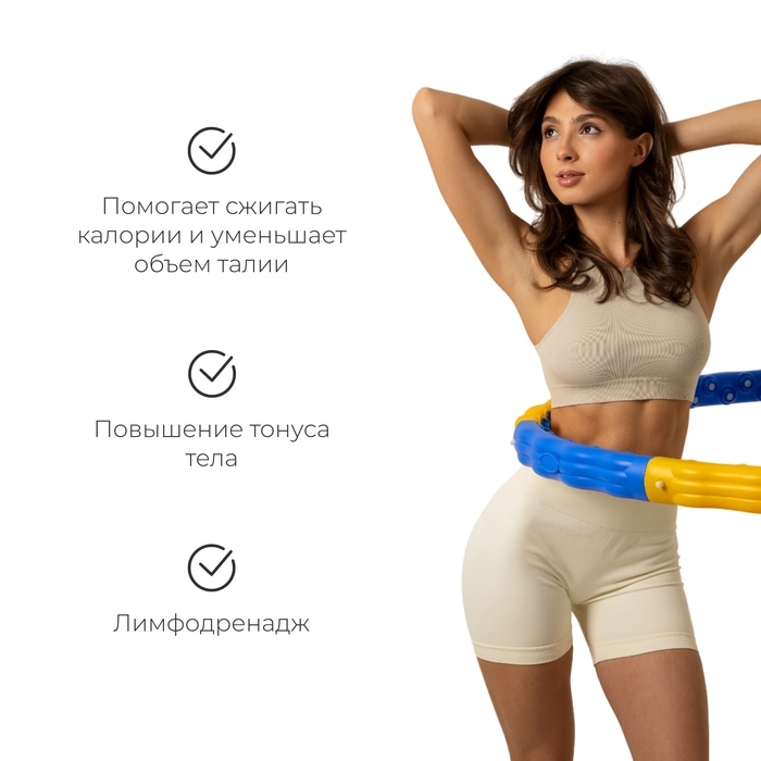 Тренировки с массажным обручем улучшают физическую форму и общее состояние тела. Обруч укрепляет мышцы живота, спины и бёдер, а также улучшает координацию и гибкость. Регулярные занятия способствуют снижению веса, формированию талии. Упражнения с обручем оказывают положительное воздействие на кровообращение и повышают общий тонус организма.