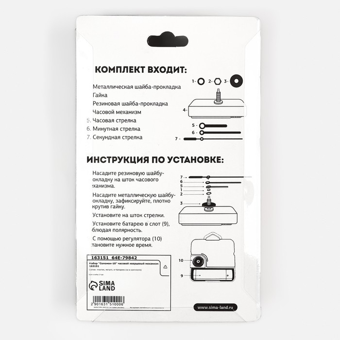 Часовой механизм со стрелками "Соломон-10", плавный ход, шток 16 мм, стрелки 74/95/133 мм